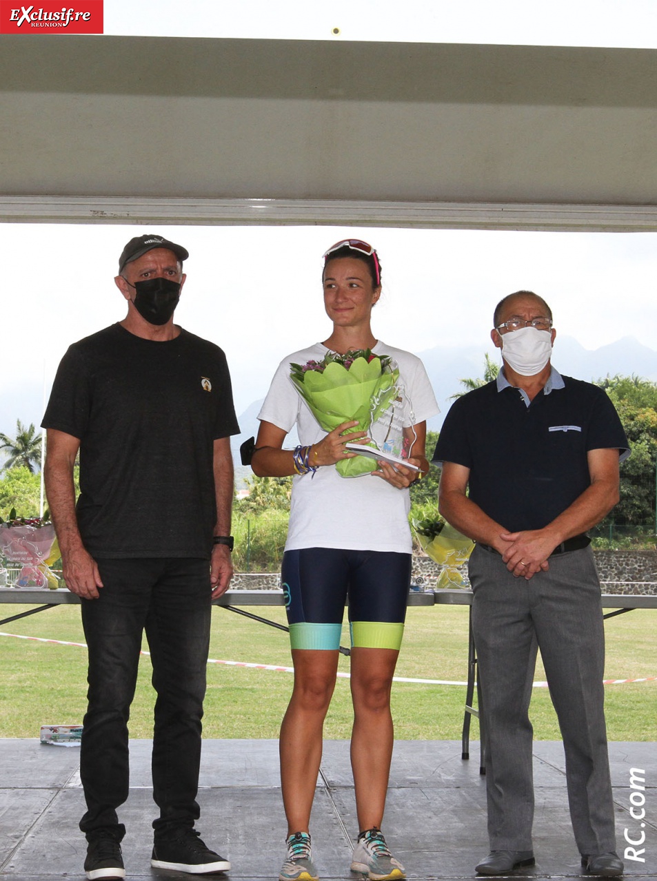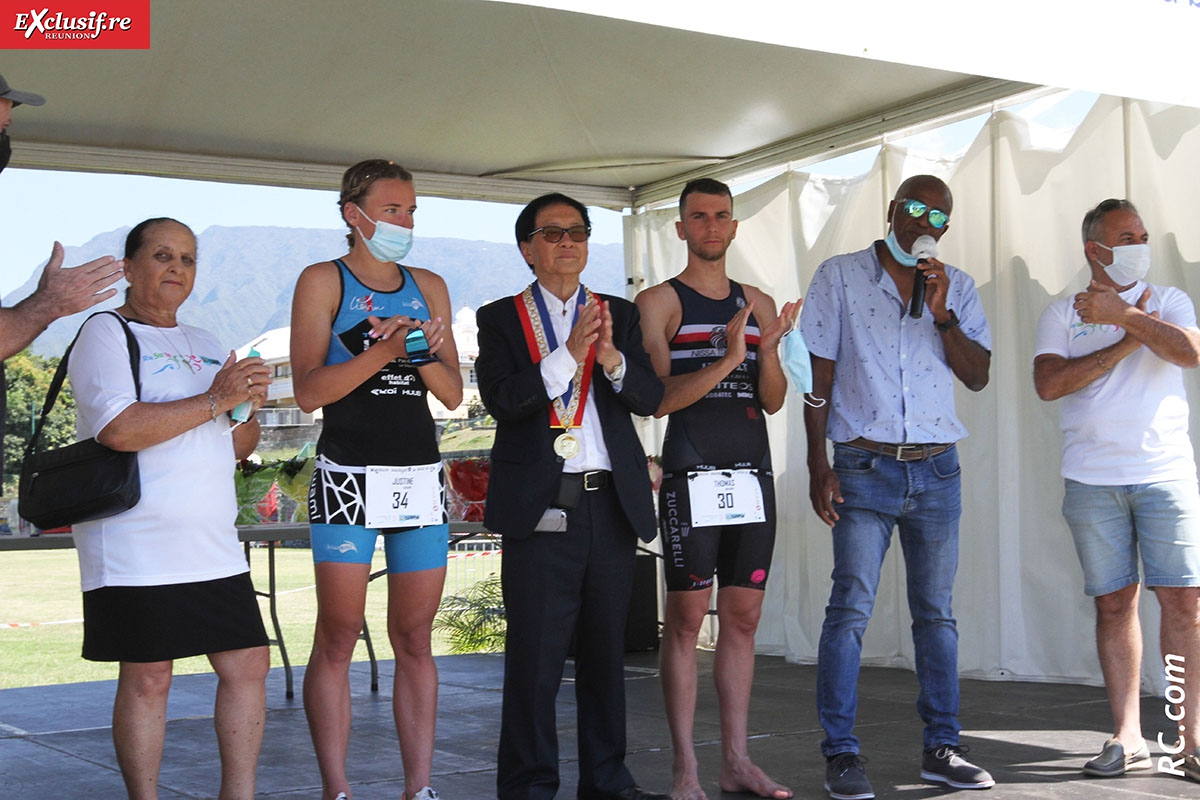 André Thien Ah Koon, maire du Tampon, était présent pour féliciter tous les participants, qu'ils soient triathlètes, organisateurs ou bénévoles, avec à ses côtés David Fontaine, le président de Run Sud Tri et plusieurs de ses collaborateurs.